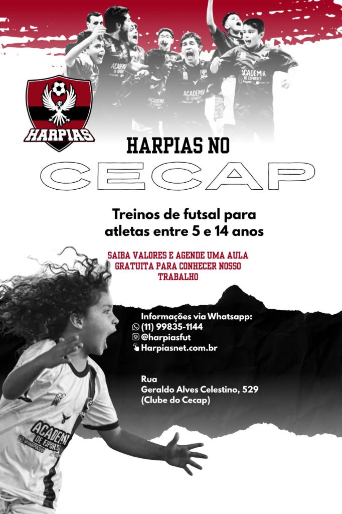 As aulas serão realizadas no Clube Cecap, localizado na Rua Geraldo Alves Celestino, 529. Para mais informações e valores, o responsável pode entrar em contato via Whatsapp no número (11) 9 9835-1144 ou no direct do Instagram, no perfil @harpiasfut.